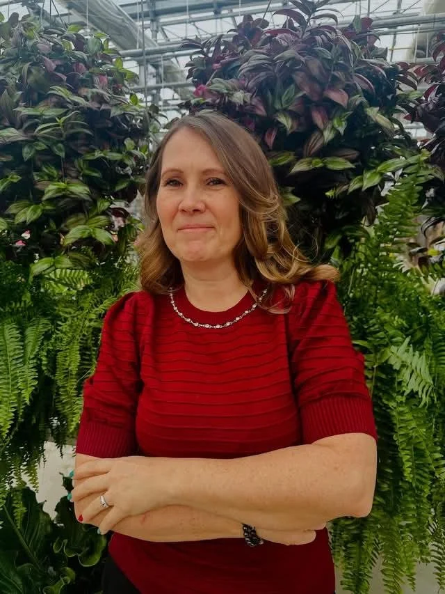 A woman with shoulder-length blonde hair, wearing a red top and a necklace, standing in front of lush green and purple plants inside a greenhouse.